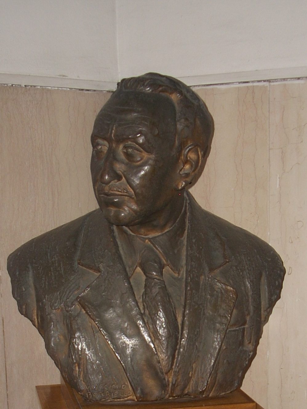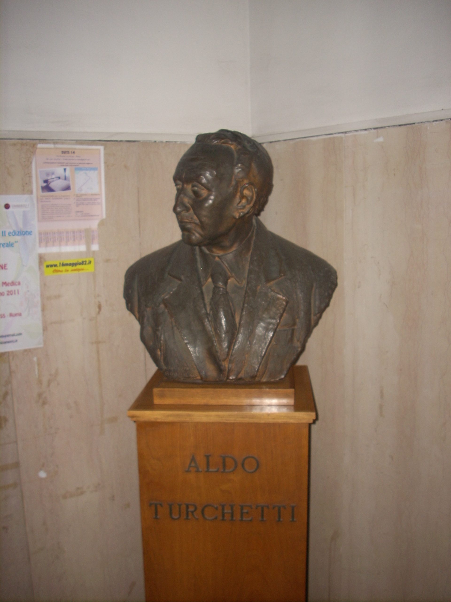 This bronze bust of Aldo Turchetti can be found in a small hallway leading to the beautiful entrance hall of the “Clinica medica” building of the Policlinico Umberto I in Rome (Viale del Policlinico, 155). The bust is placed on a wooden pedestal bearing the name of the physician. In the same room there are also the busts of Vittorio Ascoli, Luigi Condorelli and Cesare Frugoni.