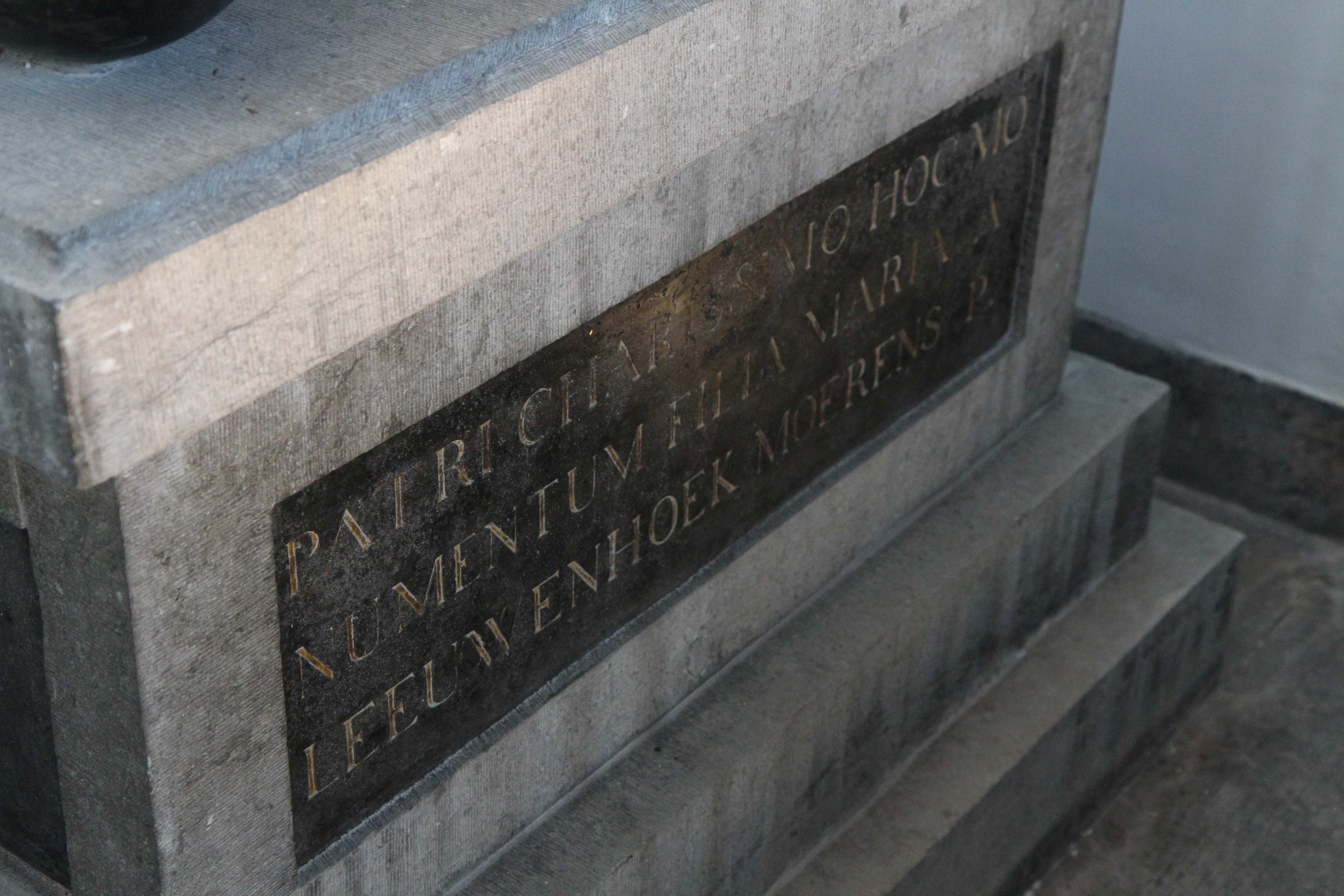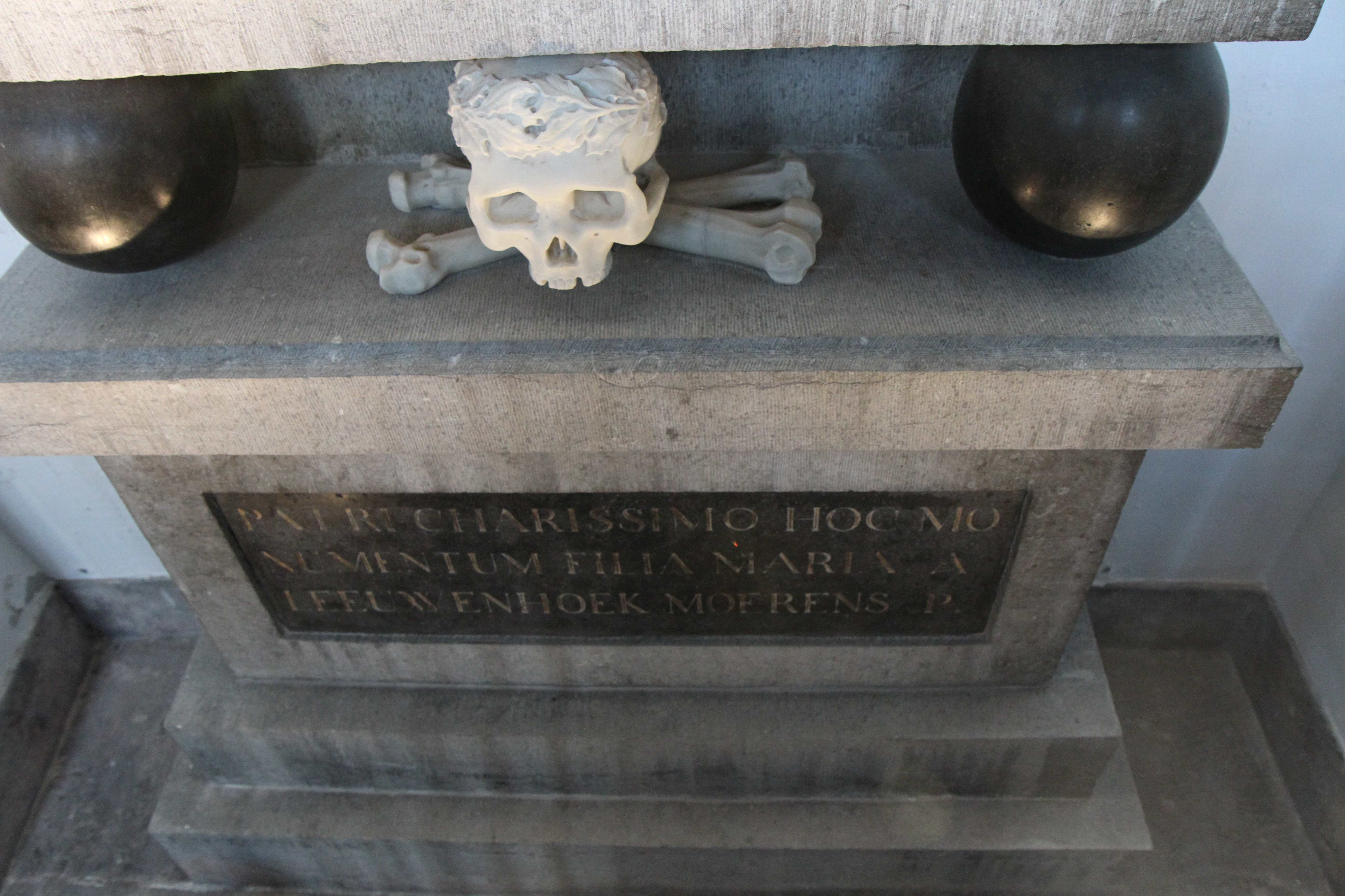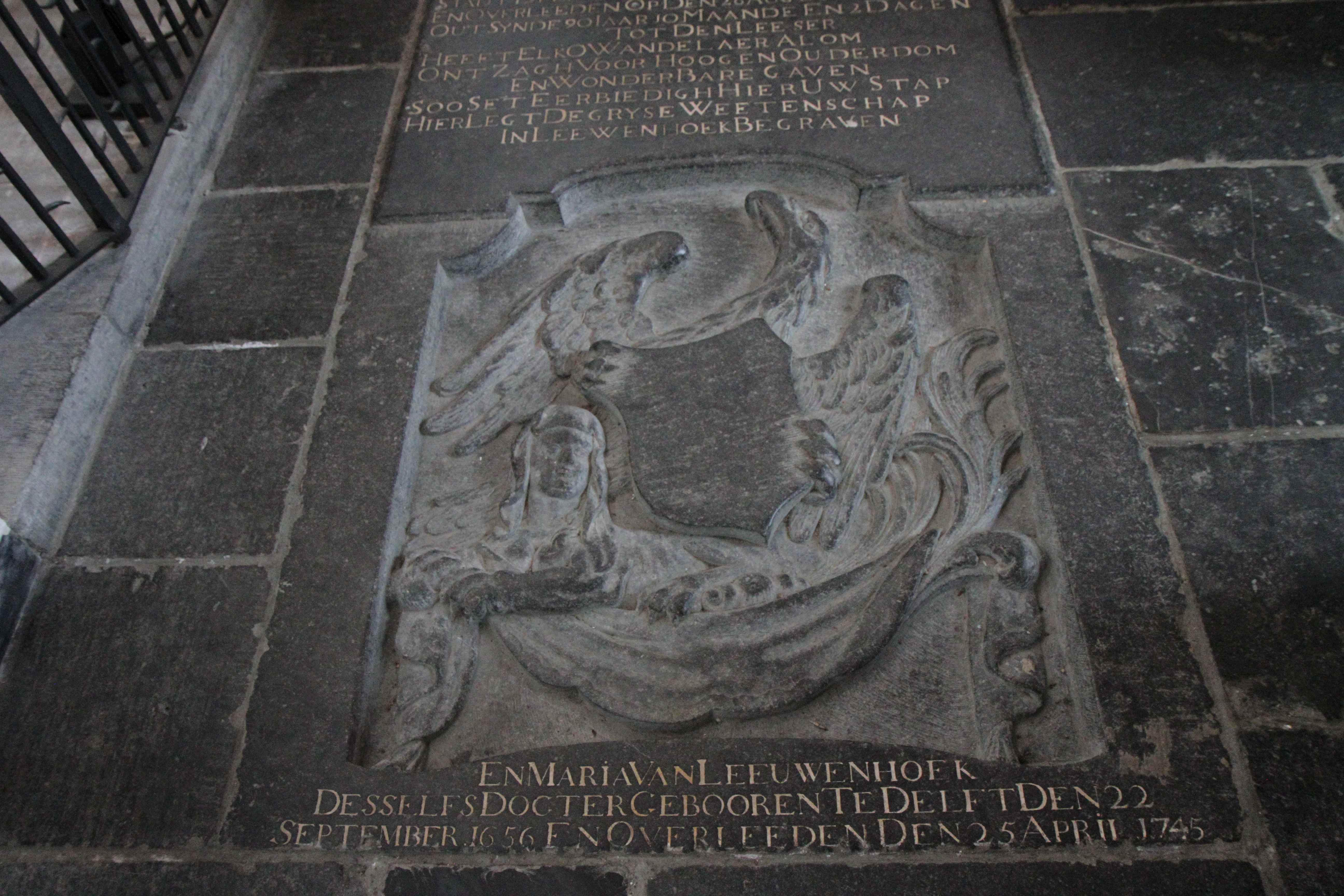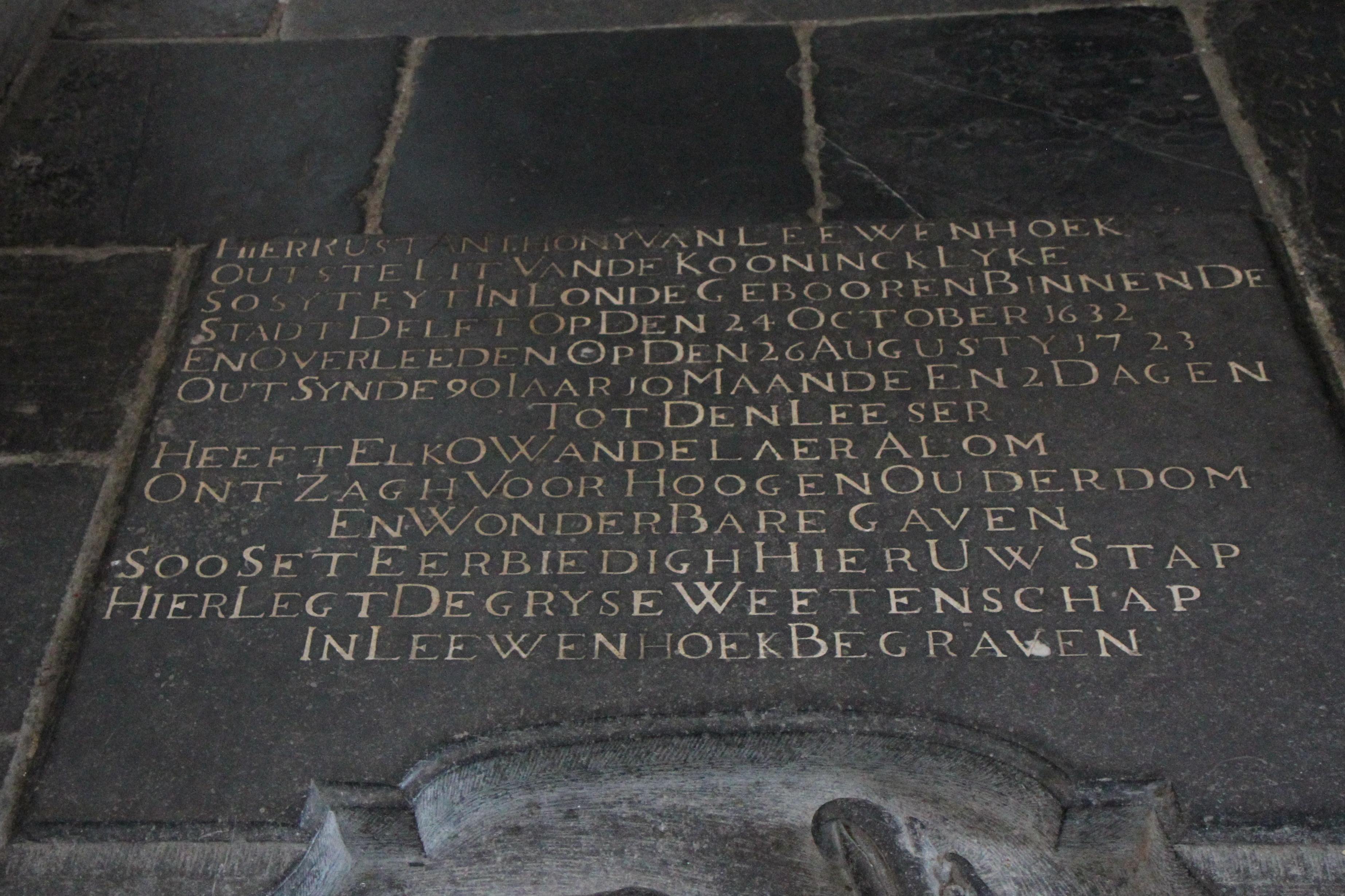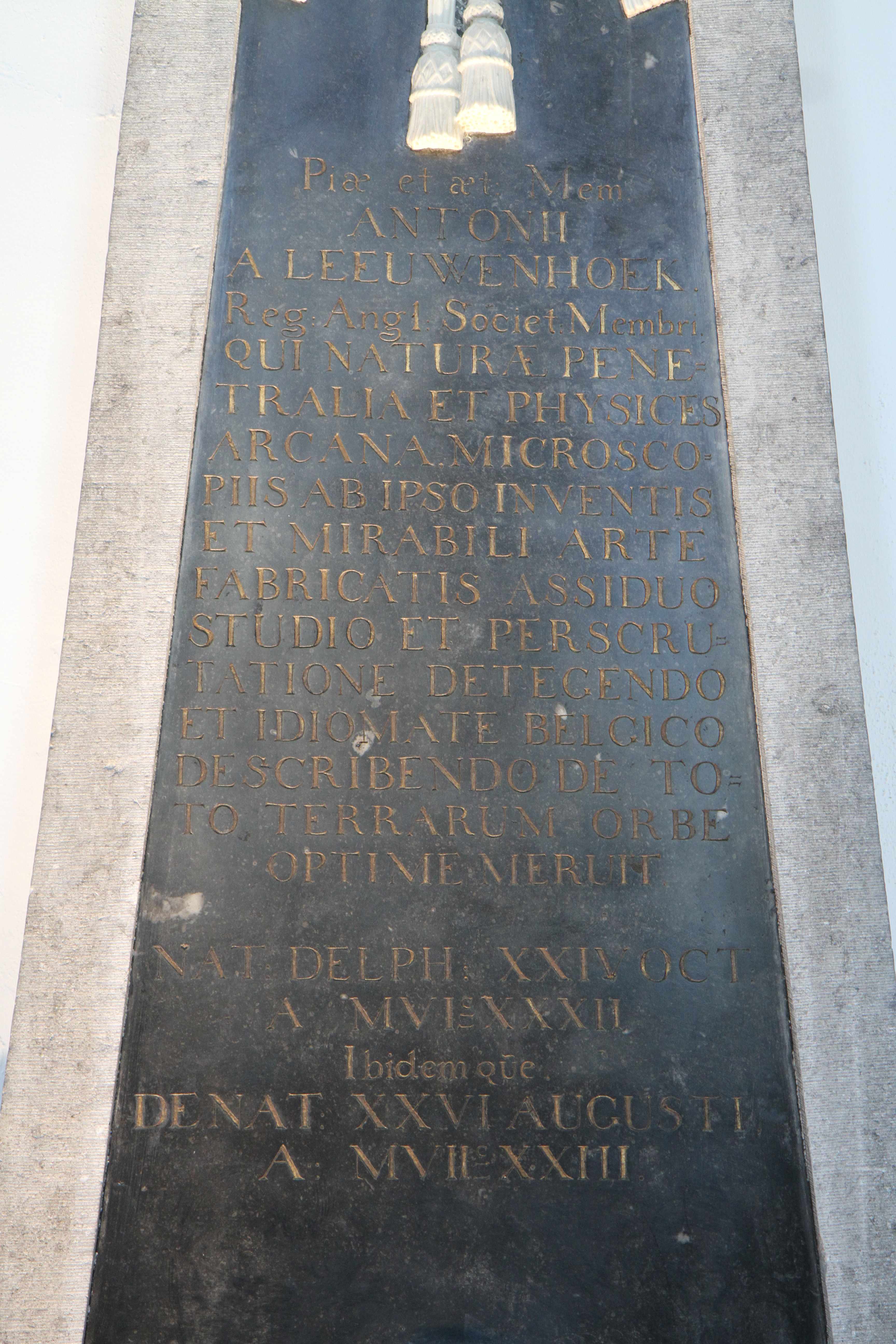 On the floor in front of the niche, the inscription on the tombstone reads: “Here rests Anthony van Leewenhoek Oldest member of the Royal Society in London, Born in the city of Delft on 24 October 1632, And died on 26 August 1723, being 90 years, 10 months, and 2 days old. To the reader”.