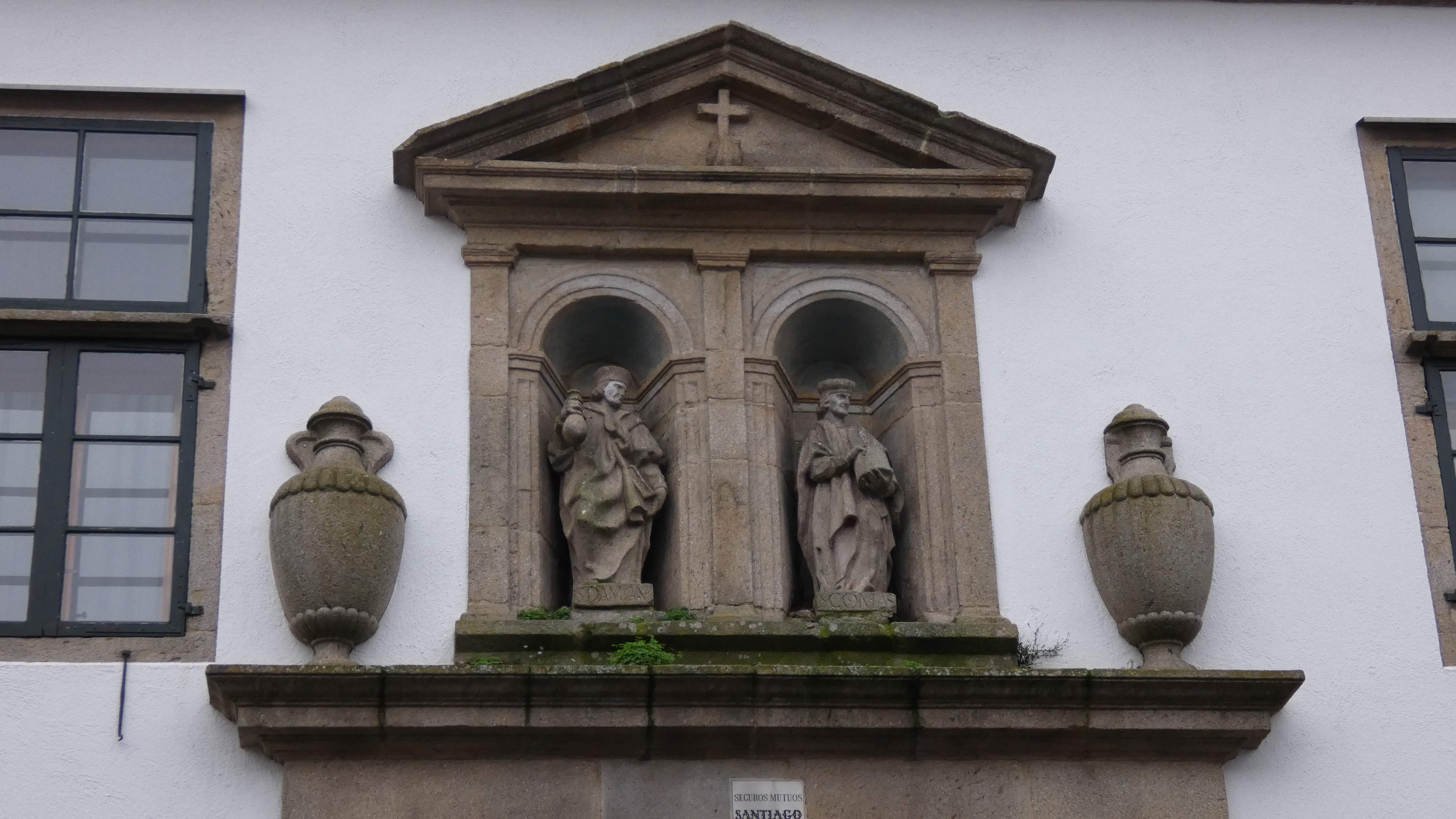These figures of Saints Cosmas and Damian, patron saints of medicine, stand in the niches above the main entrance of the Antigo Hospital de San Roque in Santiago. They are possibly attributed to the sculptor Gregorio Español, who in 1604 was working alongside Juan Dávila on the altarpiece of the Chapel of San Roque, or to his workshop.1
