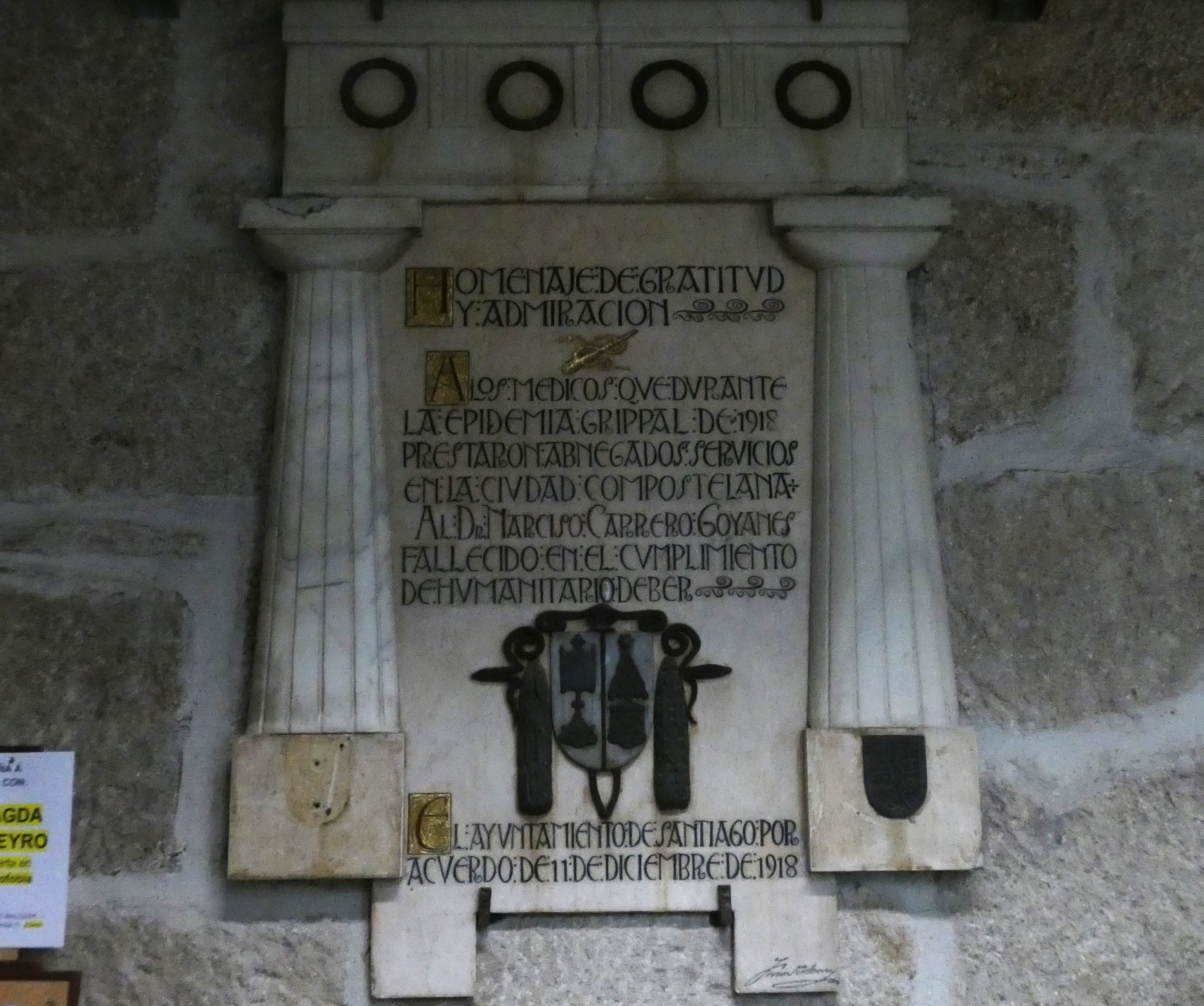 HOMENAJE DE GRATITUD / Y ADMIRACIÓN / A LOS MÉDICOS QUE DURANTE / LA EPIDEMIA GRIPAL DE 1918 / PRESTARON ABNEGADOS SERVICIOS / EN LA CIUDAD COMPOSTELANA / AL DR. NARCISO CARRERO GOYANES, / FALLECIDO EN EL CUMPLIMIENTO / DE HUMANITARIO DEBER / EL AYUNTAMIENTO DE SANTIAGO POR / ACUERDO DE 11 DE DICIEMBRE DE 1918.