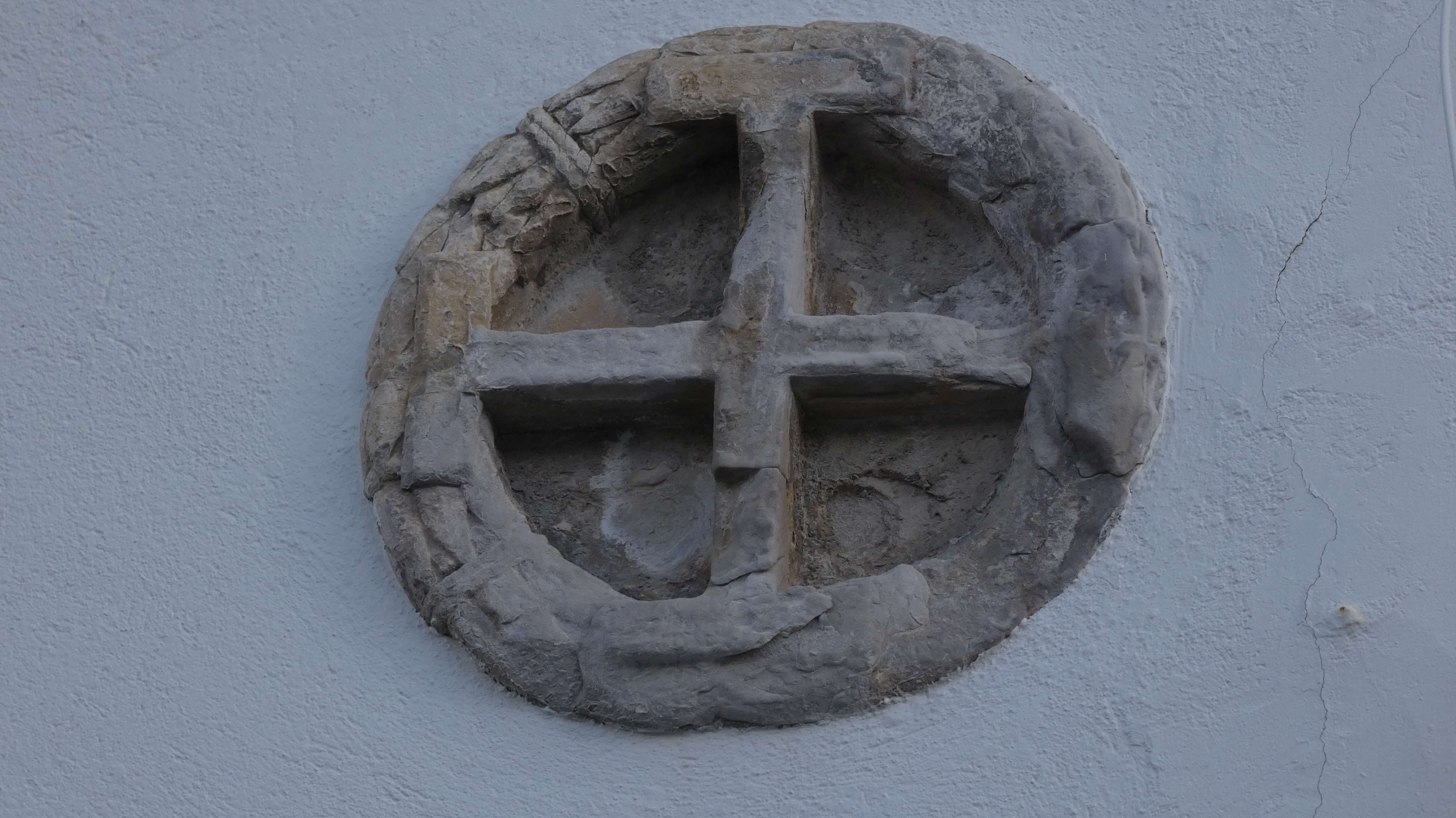 The cross located on the house at number 20 on Rúa Carretas is surrounded by a wreath.