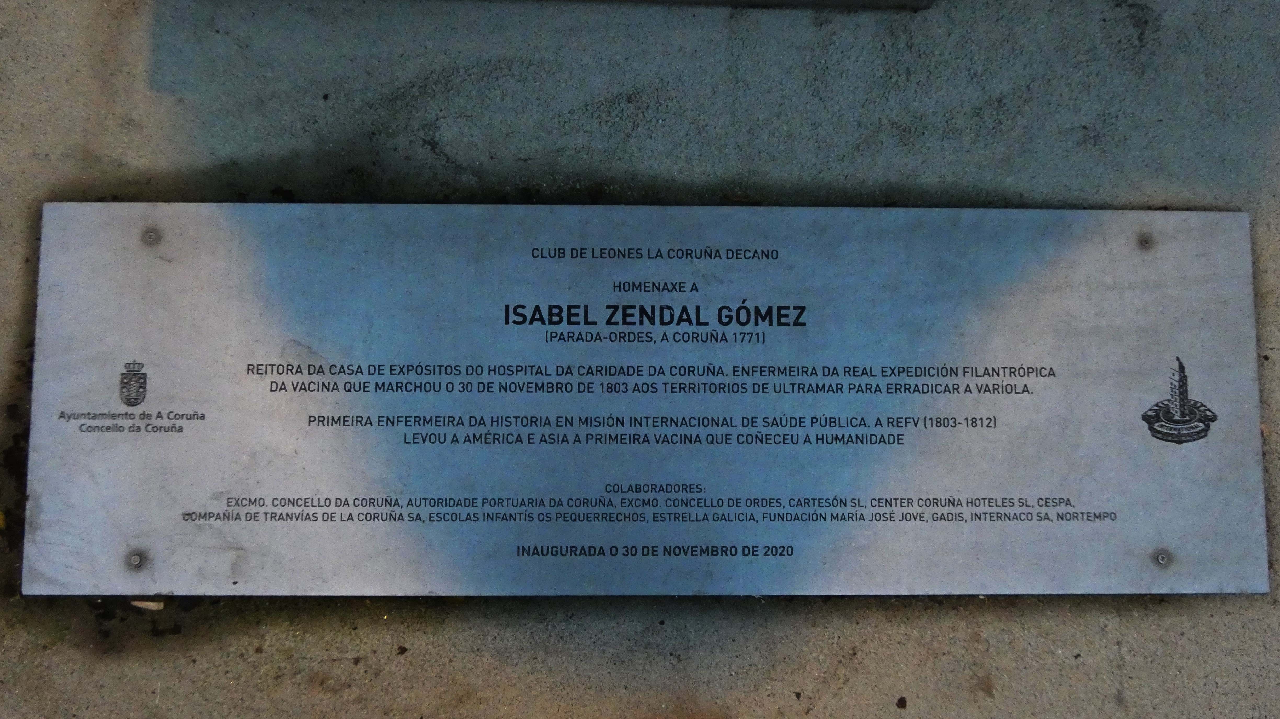 CLUB DE LEONES LA CORUÑA DECANO / HOMENAXE A / ISABEL ZENDAL GÓMEZ/ (PARADA-ORDES, A CORUÑA 1771) / REITORA DA CASA DE EXPÓSITOS DO HOSPITAL DA CARIDADE DA CORUÑA, ENFERMEIRA DA REAL EXPEDICIÓN FILANTRÓPICA / DA VACINA QUE MARCHOU O 30 DE NOVEMBRO DE 1803 AOS TERRITORIOS DE ULTRAMAR PARA ERRADICAR A VARÍOLA. / PRIMEIRA ENFERMEIRA DA HISTORIA EN MISIÓN INTERNACIONAL DE SAÚDE PÚBLICA, A REFV (1803-1812)/ LEVOU A AMÉRICA E ASIA A PRIMEIRA VACINA QUE COÑECEU A HUMANIDADE / COLABORADORES: / EXCMO CONCELLO DA CORULA, AUTORIDADE PORTUARIA DA CORUÑA, EXCMO. CONCELLO DE ORDES, CARTESÓN SL, CENTER CORUÑA HOTELES SL, CESPA / COMAPAÑÍA DE TRANVÍAS DE LA CORUÑA SA, ESCOLAS INFANTÍS OS PEQUERRECHOS, ESTRELLA GALICIA, FUNDACIÓN MARÍA JOSÉ JOVÉ, GADIS, INTERNACO S.A, NORTEMPO / INAUGURADO O 30 DE NOVEMBRO DE 2020